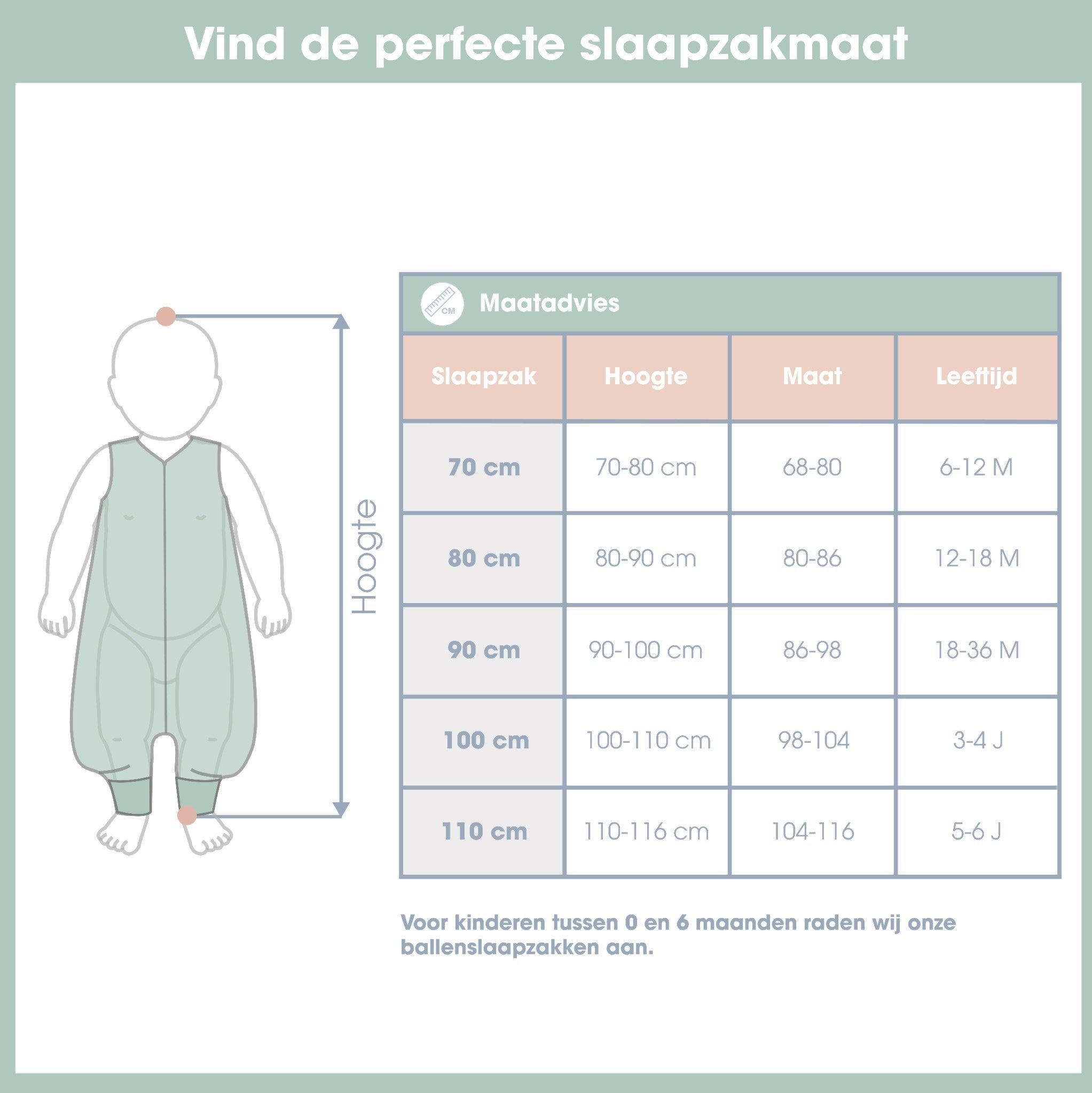 Een slaapzak met voetjes is meestal geschikt vanaf het moment dat je kind mobieler wordt – dus wanneer het begint te kruipen, staan of lopen. Onze slaapzakken met voetjes zijn beschikbaar vanaf maat 70.