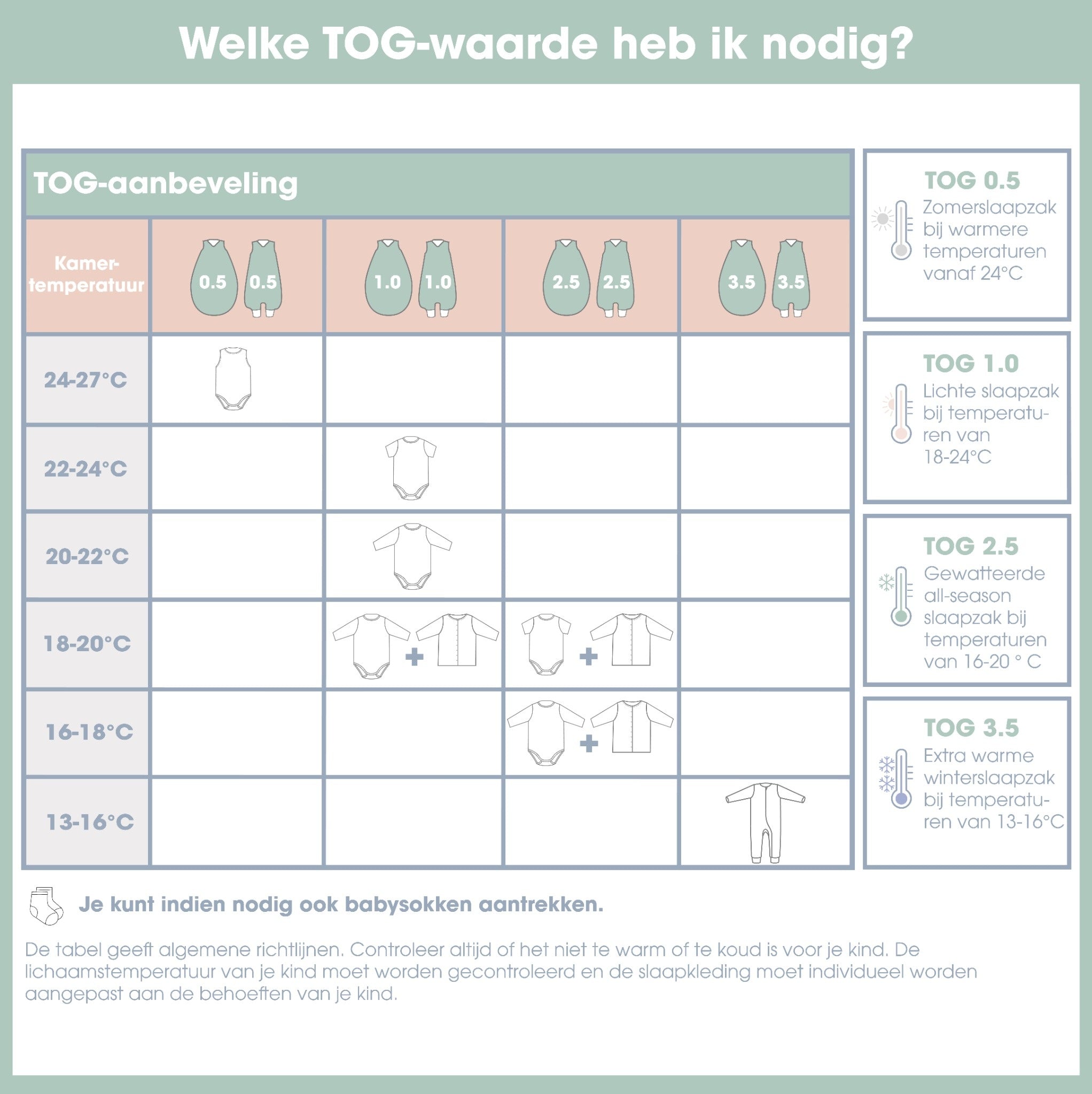 - Winter: De gevoerde modellen met 2.5 of 3.5 TOG houden je kind heerlijk warm – helemaal zonder extra deken.