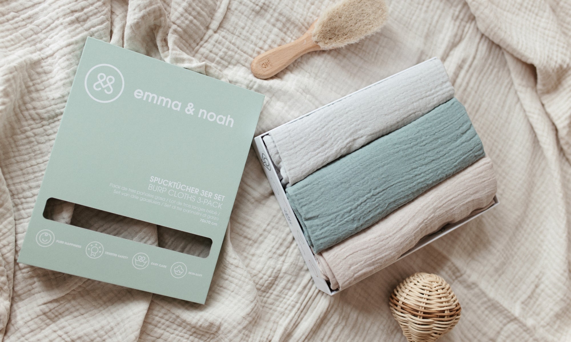De spuugdoekjes van emma & noah zijn trouwe helpers in het dagelijks leven met je baby – praktisch, stijlvol en met veel liefde ontworpen. Dankzij het handzame formaat van 70x70 cm en het dubbel geweven mousseline van 100% biologisch katoen zijn ze bijzonder absorberend – veel beter dan gewone spuugdoekjes.