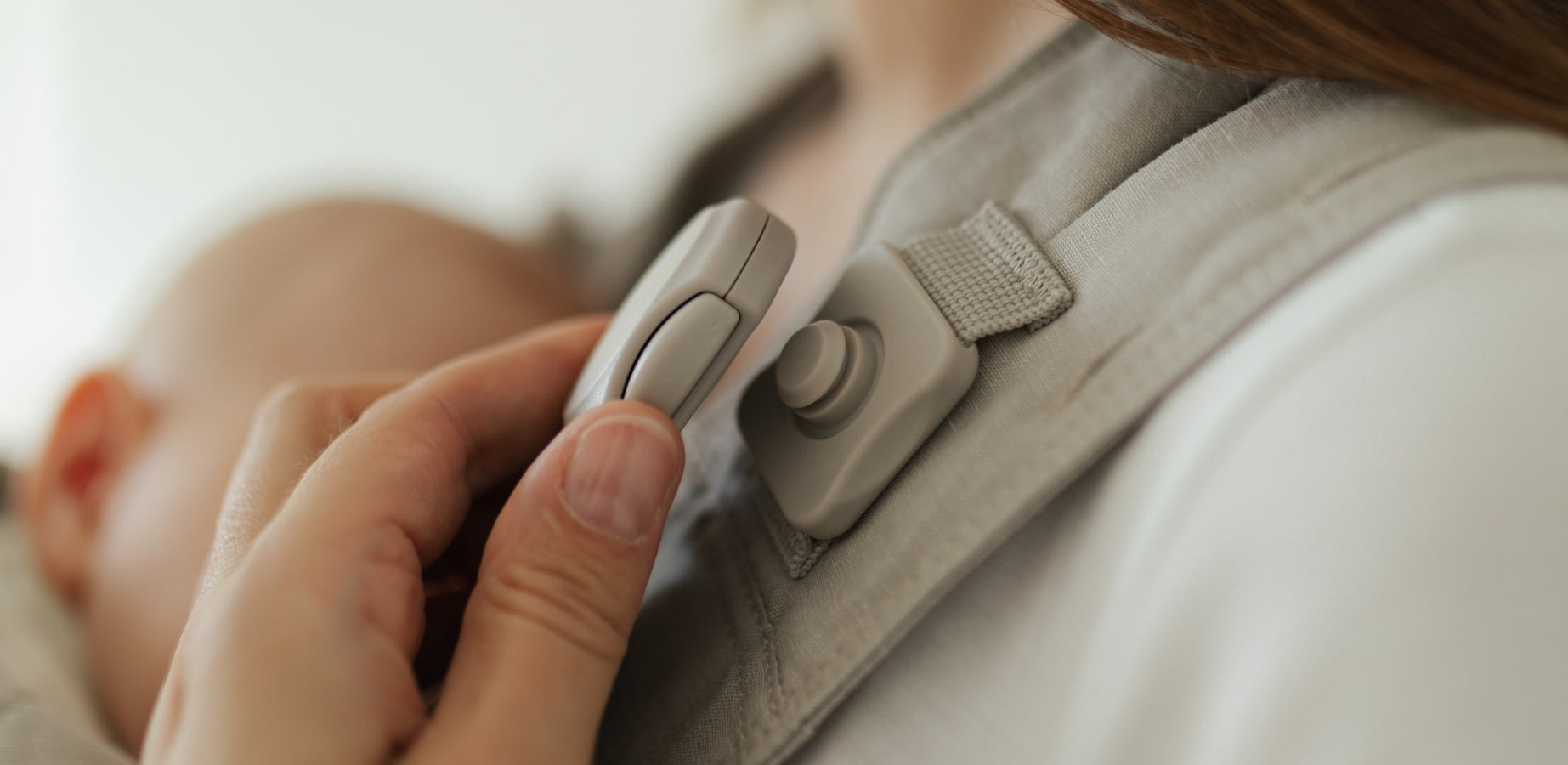 Leg eerst de drager aan, plaats daarna de baby. Stille, veilige magneetsluitingen voor geruisloos neerleggen – ideaal als je baby slaapt.